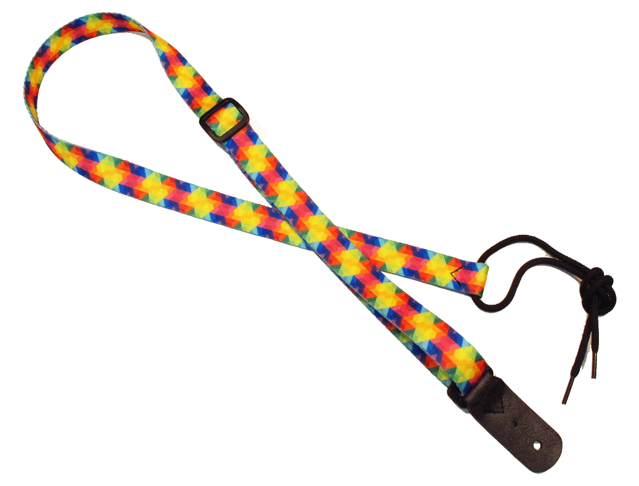 Our new comfortable "Mandolin/Ukulele Straps" are available in 3/4" and 1" widths and will accomodate both Mandolins and Ukuleles. Each strap features a high-tech synthetic leather end tab to affix over the strap button on your instrument and a strong woven nylon lace to attach to the headstock. The 3/4" straps are available in 13 solid colors and the 1" Strap in 21 Solid colors. Both straps are avaialable in many different graphic design patterns with designs being constanly updated as we find cool new designs. The webs are either jacquard woven in nylon, polypropylene or other textile blends or sublimation printed on polyester webbing. Sublimation printing is a process that actually embeds that design into the webbing on a molecular level. This process creates long lasting, durable straps in bright colors and patterns.